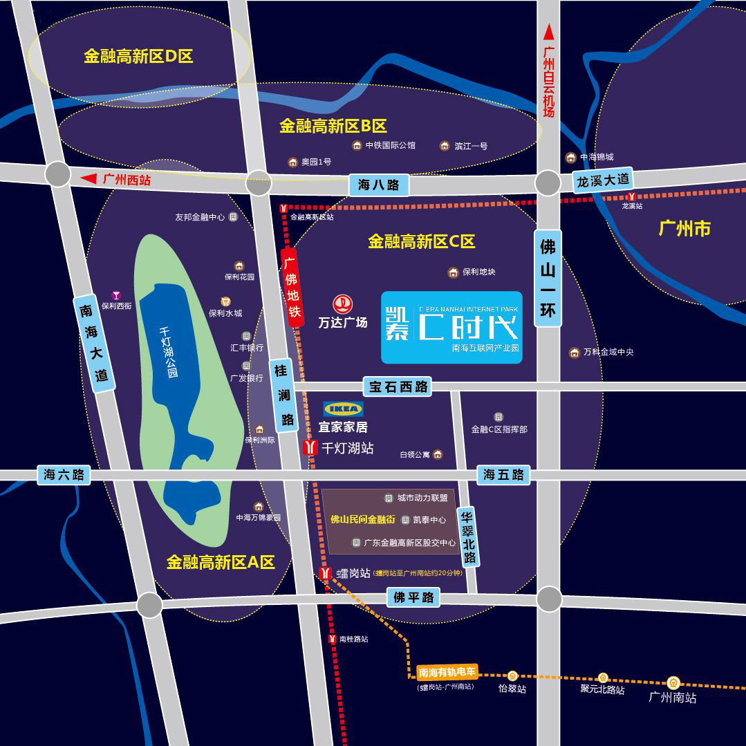 C时代南海互联网产业园,由南海区技术局和金融C区共同发起,凯泰创展科技园有限公司投资运营,是金融高新区重点打造的项目之一。项目地处广东金融高新区C区核心,毗邻南海万达,佛山宜家,紧邻佛山一环,5分钟车程即到广佛地铁千灯湖站和金融高新区站,10分钟车程可到南海有轨电车虫雷岗站,得天独厚的区位优势,畅享半小时珠三角经济生活圈。